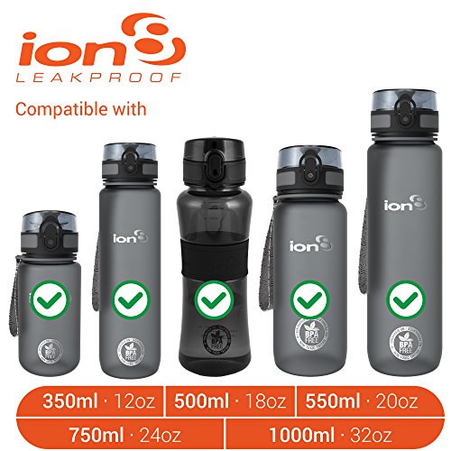 One size fits all Ion8 water bottles – 350ml (12oz), 500ml (18oz), 550ml (20oz), 750ml (24oz) and 1,000ml (32oz).