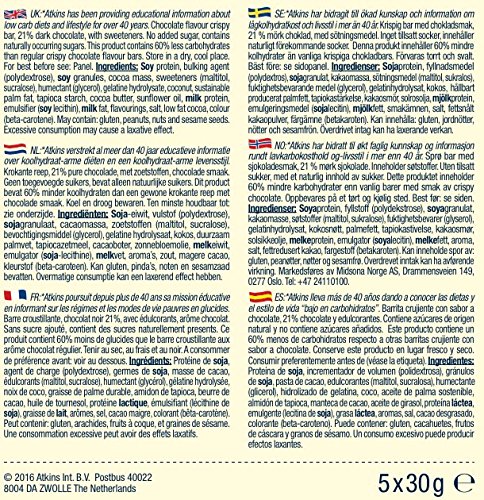 4 to hand packing containers of 5 x 30g chocolate crisp snack bars with tasty soy crisps and a clean chocolate base