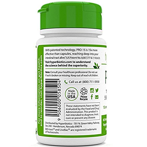 GET 15 TIMES MORE RESULTS THAN WITH CAPSULES. With superior patented technology, our living organisms reach deep into your intestinal tract where they are needed most. Our formula will even reach your large intestine. See below to remember the Science at the back of the Superiority.;STAY WELL. 80% of your immune system is in your gut, and when probiotics (the good guys) are abundant in your body, it becomes harder for the bad guys to settle in. PRO-15 replenishes a good option bacteria for optimal digestive and immune health, helps balance yeast growth, and promotes daily relief from gas, bloating, and irregularity. Life must be easy.;LIFT YOUR MOOD AND ENERGY LEVELS. Fatigue and irritability are frequently end result of the poor vitamin and nutrient absorption. PRO-15 helps create a microenvironment inside your digestive system that promotes full mineral absorption so you’ll in any case feel like your happy, energetic, and vibrant self.;RELIEVE YOUR SENSITIVE STOMACH. Hyperbiotics PRO-15 is released at consistent levels all the way through the day and all the way through your Gl tract; whereas other capsules more closely resemble a bomb being dropped in your upper stomach – releasing all organisms at one time, frequently causing digestive upset.;LOSE WEIGHT. New studies show that gut microflora may make stronger your metabolism and accelerate fat loss. Get your gut back into equilibrium so your waistline will follow.